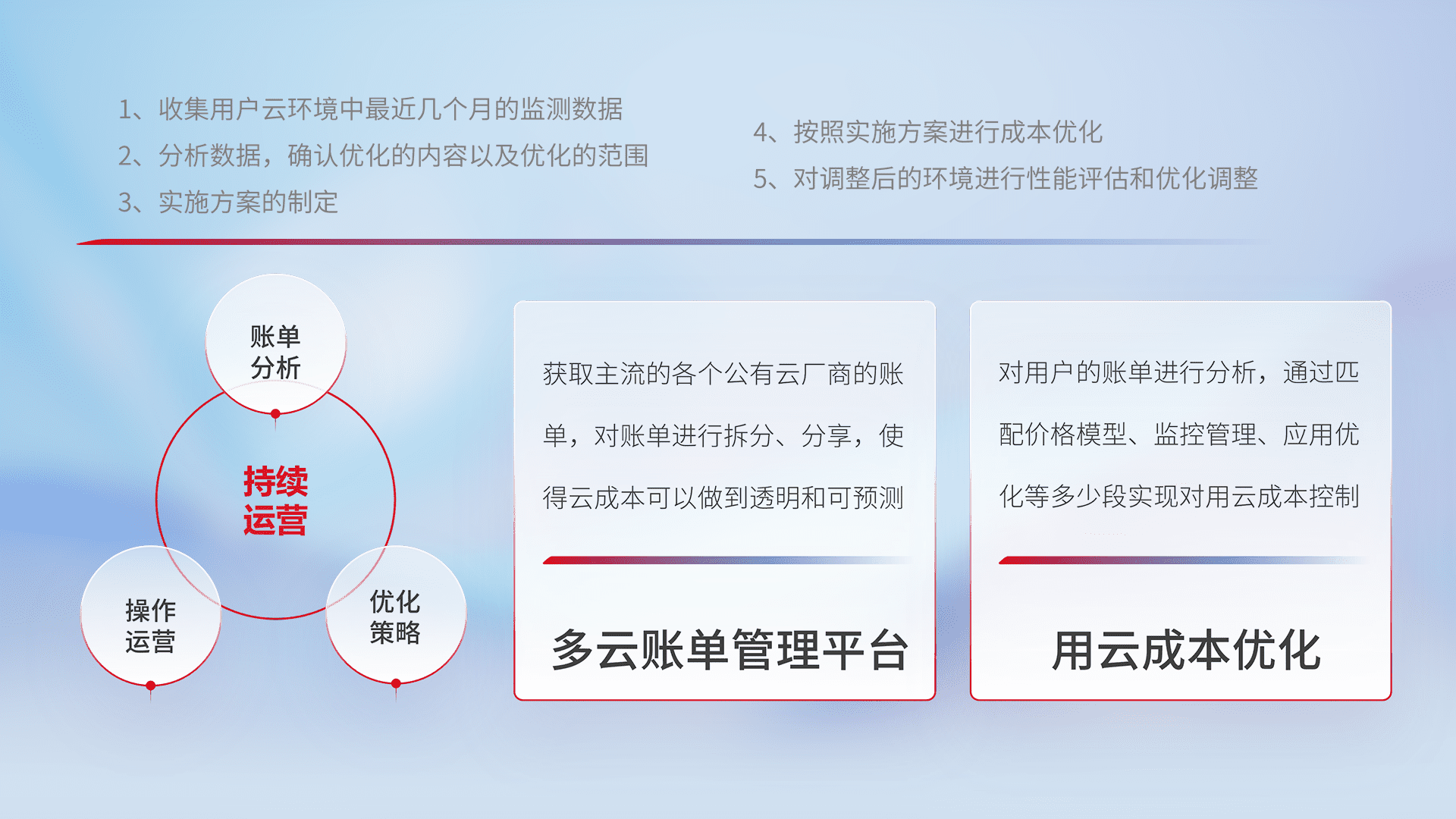 通过多云纳管,,,以统一的资源数据模型把客户的云资源进行抽象和封装,,,进而实现对多云资源的统一操作,,保障云资源管理的可靠性、、、稳定性与可用性。。。量身定制化运维内容,,配置、、开发运维、、补丁管理、、备份、、、监控、、、认证和访问管理、、审计和日常巡检等,,,保障在用云过程中的可靠度,,稳定度以及高可用率。。。